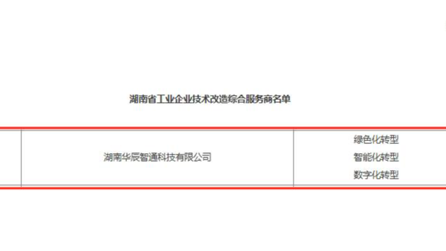 近日,湖南省工業(yè)和信息化廳正式公布湖南省工業(yè)企業(yè)技術改造綜合服務商入選名單,湖南華辰智通科技有限公司成功入選“綠色化轉型”、“智能化轉型”、“數(shù)字化轉型”三大類別服務商。